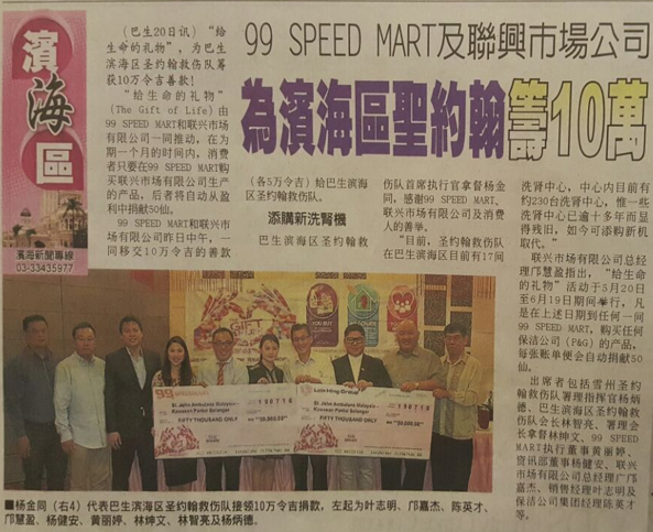 Our joint CSR project “The Gift of Life” was a hit! We have successfully raised RM100,000 to St John’s Ambulance of Malaysia to be used towards the purchase of additional dialysis machines for their patients. We would like to thank our project partners 99 Speedmart Sdn Bhd and also Procter & Gamble (M) Sdn Bhd for their cooperation, as well as all the shoppers who have made this project a success.