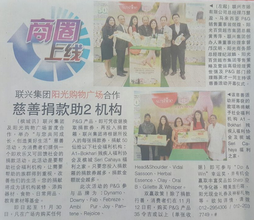 Lein Hing Group partnered with Sunshine Wholesale Mart Sdn Bhd to initiate a month-long CSR program at Sunshine supermarkets in Penang. This program raised RM20,000 which was donated to Persatuan Kebajikan Orang Kurang Upaya Al Bokhari and Pertubuhan Rumah Kebajikan Seri Cahaya Pulau Pinang.